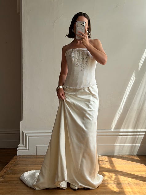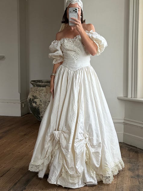 Rainbow beaded velvet, pure silk basque waist with rosettes, ribbon and crochet embroidered mini, 90s Australian designer two-piece set, 90s couture lace up corset dress, cherry blossoms and more <3