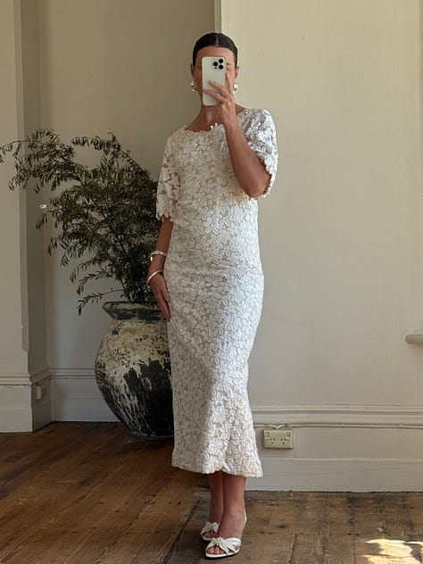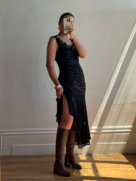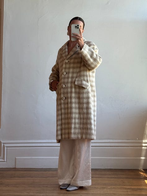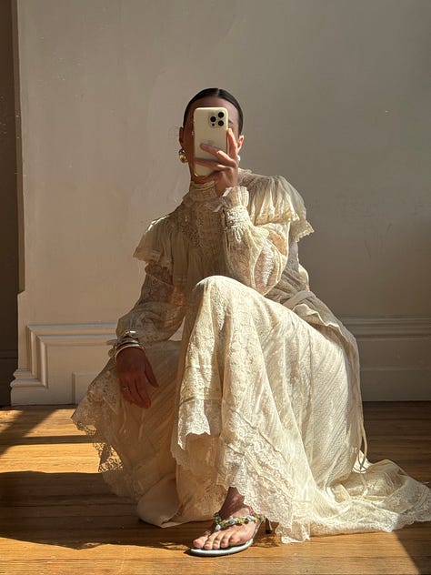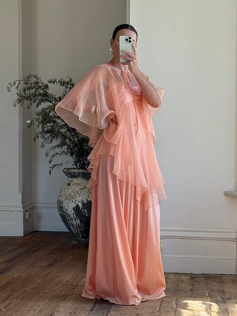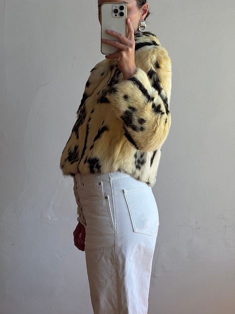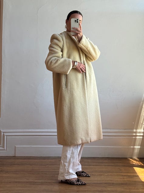 Chloé coded bridal, ostrich feather micro mini, chunky cream shearling coat, spotted rabbit fur jacket, 90s silk rosette gown (in a size large!!), the sweetest 70s apricot bridesmaid dress and more...