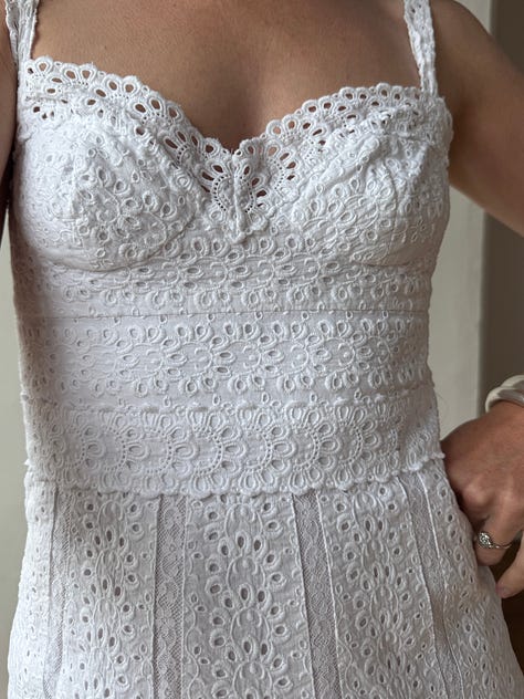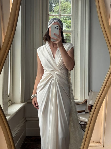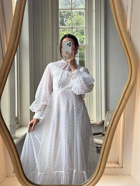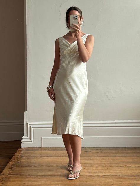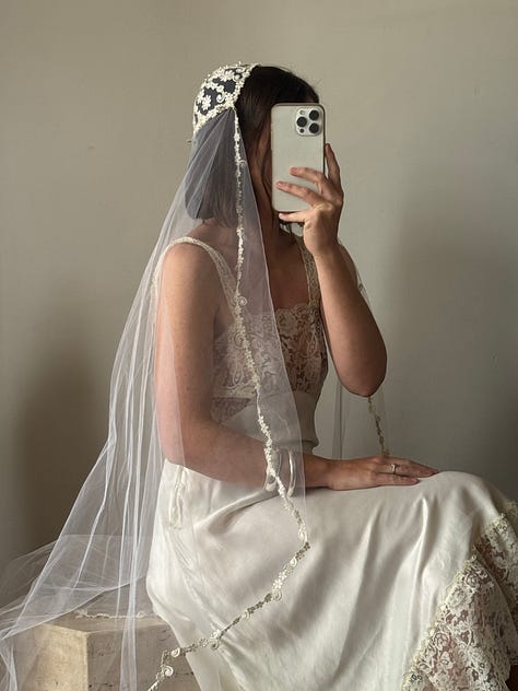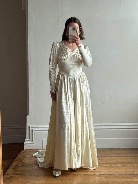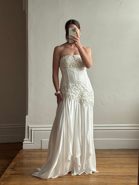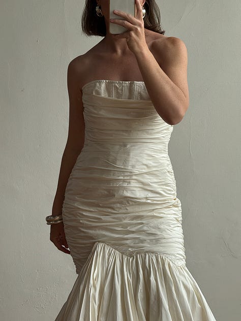 Pure silk taffeta fishtail gown, rare juliet cap veil, draped sheer georgette, brodiere anglaise bustier mini dress, 1940s liquid satin, swiss dot prairie bride, 90s embellished strapless and more.